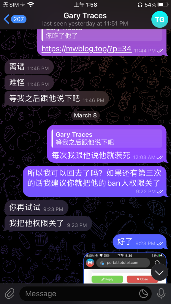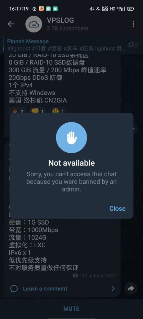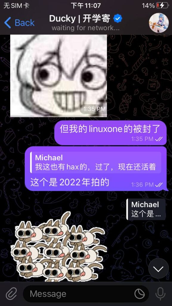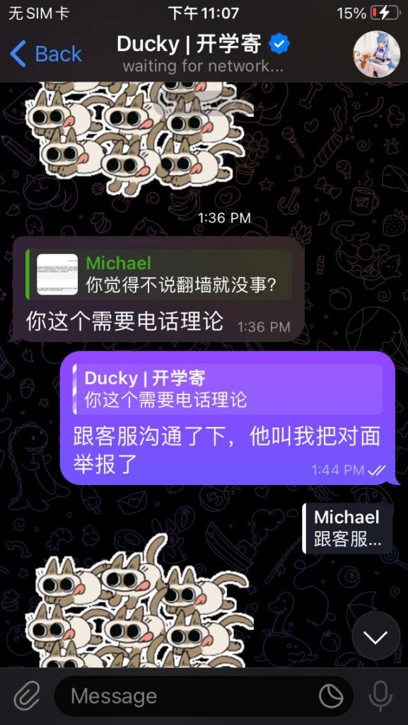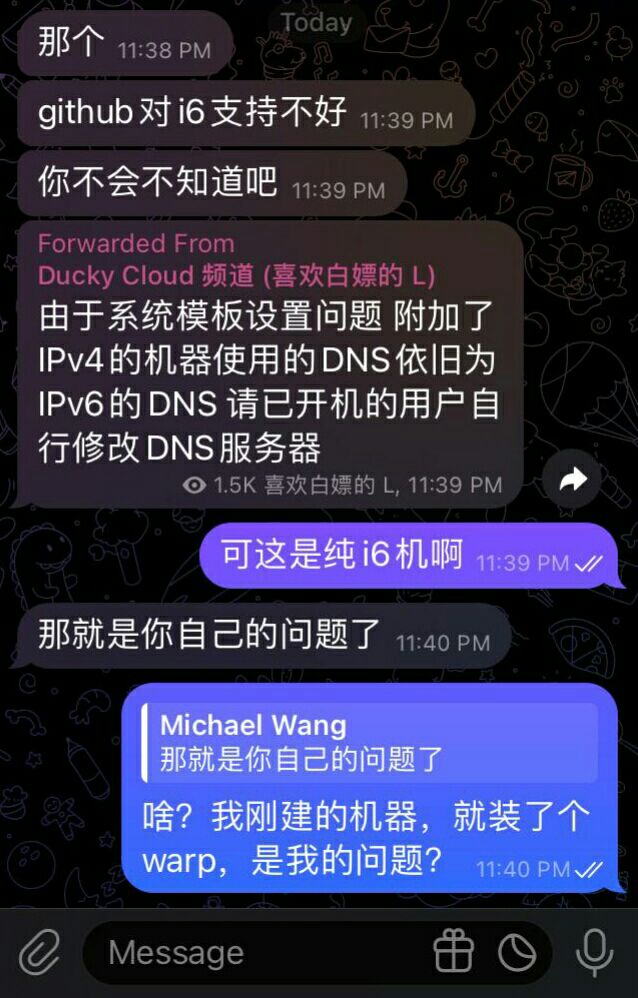 一个月后,mtf出现了。它的售价是4个月永久,如果你手速快的话也可以拿到永久免费的vps。我认为,它也是个好厂商,因此我也做了推广它的视频。我也在双方群里都说明了立场:“我的立场是中立,我只使用双方的产品,打架我不参与,除非做的太过分。”有一天,mtf举办了一个活动:只要你给岛主打骚扰电话或发骚扰短信,你就可以获得一台永久免费的vps!然后岛主用中英文双语发了通知,谴责这一行为。然而,他开头第一句就写错了。中文是“什么你要……”。如果要翻译,应该翻译为“What?You want …..”。结果岛主翻译为“What are you saying,is……”。我就指出了错误,对此公告的英文版本做了修改,并尽自己所能做出了俄文和法文版本。做完这些事后,我向mtf的管理做了解释,我认为这只是学科知识的探讨,并不涉及干架。结果岛主看到了这条信息,又看到我的频道里有宣传mtf的视频,就把我ban了。这才有了岛主篇的扯皮记录。